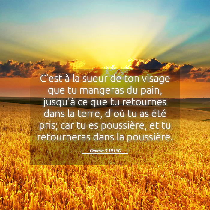 « À la sueur de ton visage tu mangeras du pain, jusqu’à ce que tu retournes à la terre; car c’est d’elle que tu as été pris ; car tu es poussière, et tu retourneras à la poussière. »