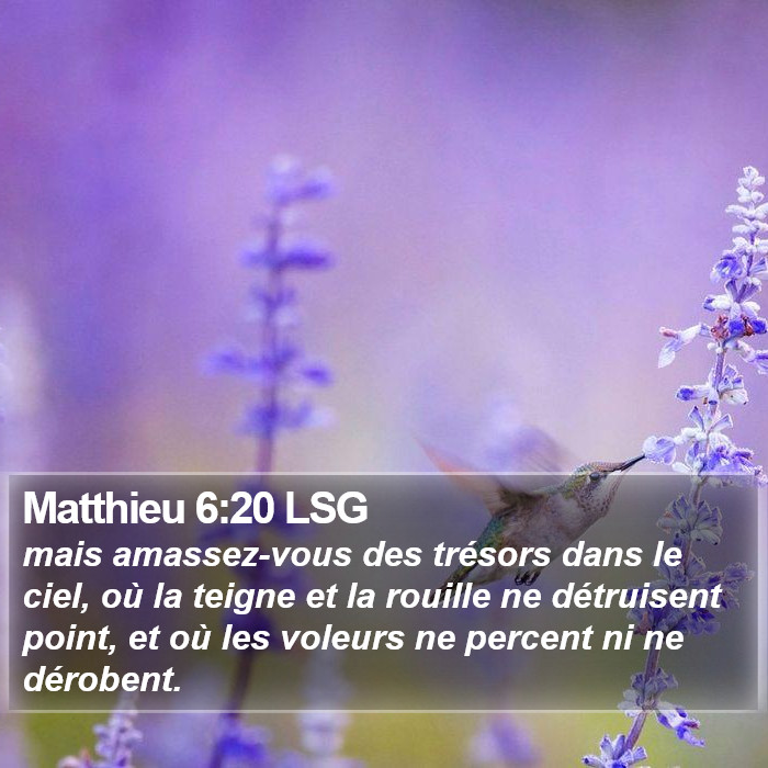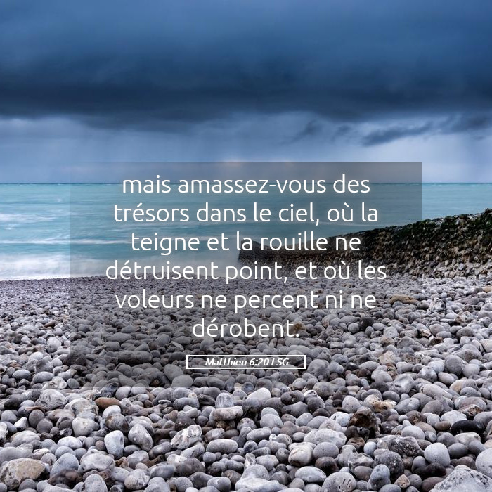 20 Mais amassez-vous des trésors dans le ciel, où la teigne et la rouille ne détruisent point, et où les voleurs ne percent ni ne dérobent.