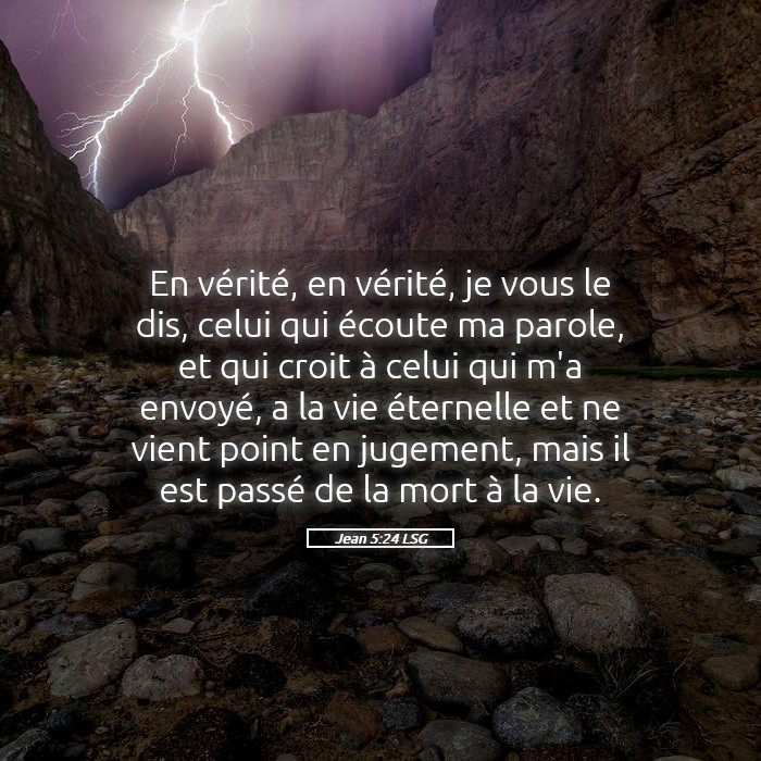 Jean 5:24 – « En vérité, en vérité, je vous le dis, celui qui écoute ma parole et qui croit à celui qui m’a envoyé a la vie éternelle et ne vient point en jugement, mais il est passé de la mort à la vie. »