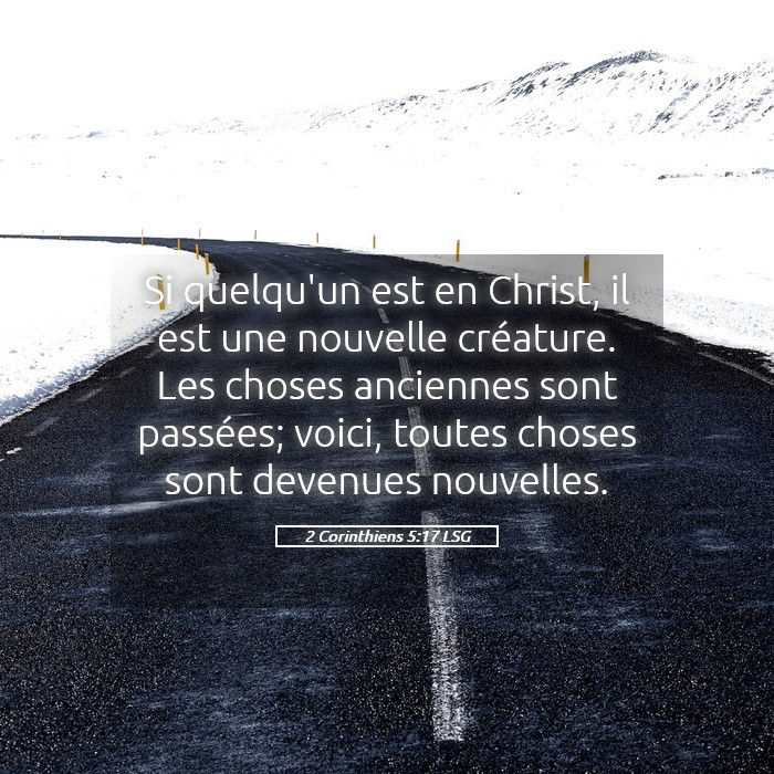 2 Corinthiens 5:17 – « Si quelqu’un est en Christ, il est une nouvelle créature. Les choses anciennes sont passées ; voici, toutes choses sont devenues nouvelles. »