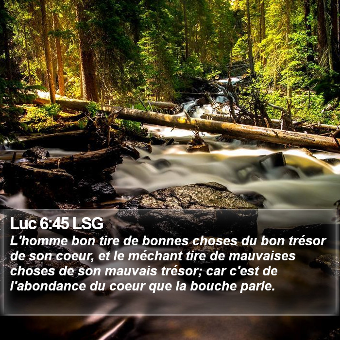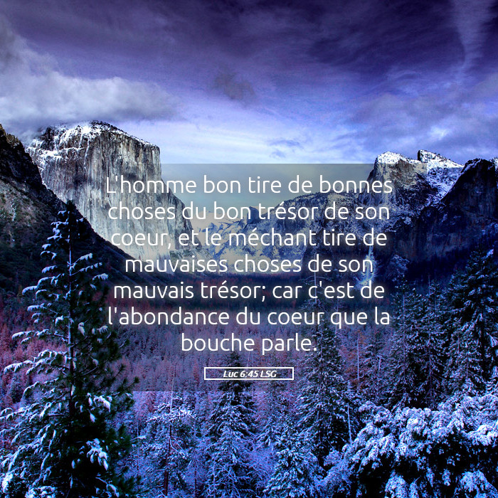 Luc 6:45 — « L’homme bon tire de bonnes choses du bon trésor de son cœur, et le méchant tire de mauvaises choses de son mauvais trésor ; car c’est de l’abondance du cœur que la bouche parle. »