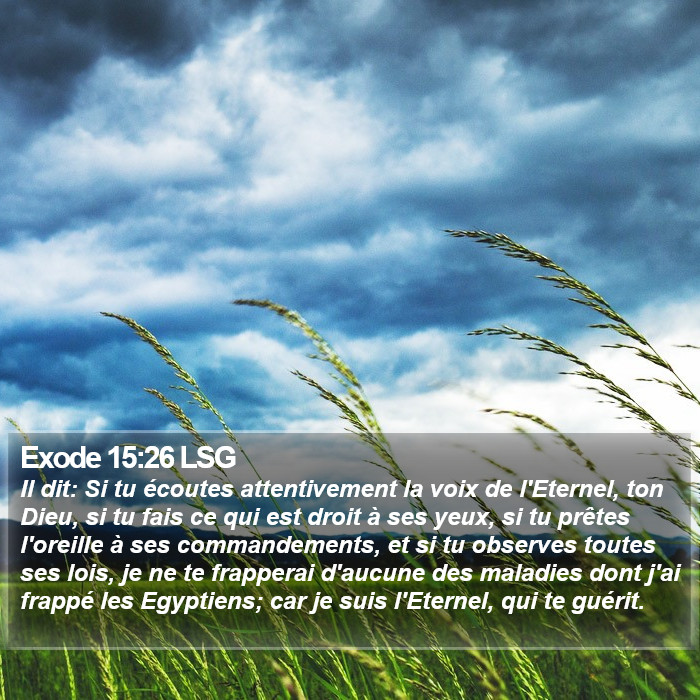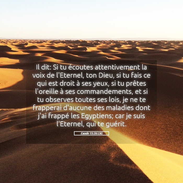 « Il dit : Si tu écoutes attentivement la voix de l’Éternel, ton Dieu, si tu fais ce qui est droit à ses yeux, si tu prêtes l’oreille à ses commandements, et si tu observes toutes ses lois, je ne te frapperai d’aucune des maladies dont j’ai frappé les Égyptiens ; car je suis l’Éternel, qui te guérit. »