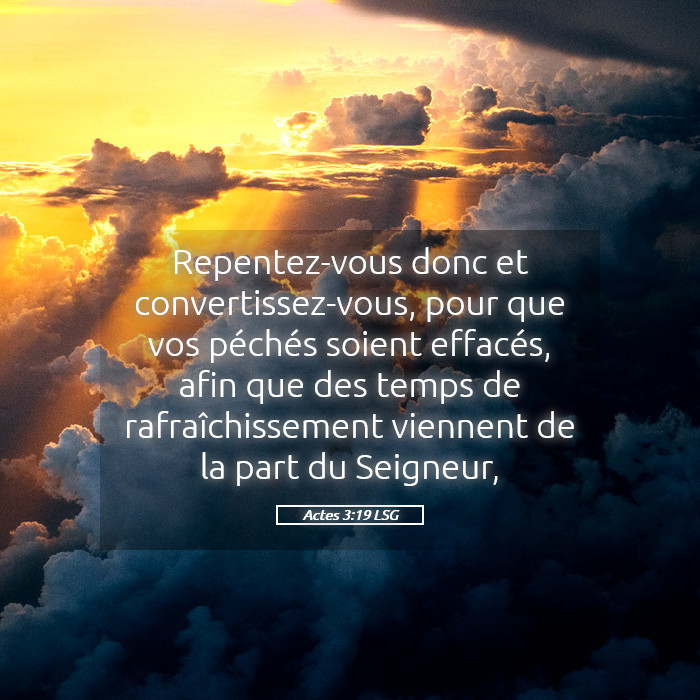 « Repentez-vous donc et convertissez-vous, pour que vos péchés soient effacés, afin que des temps de rafraîchissement viennent de la part du Seigneur. »