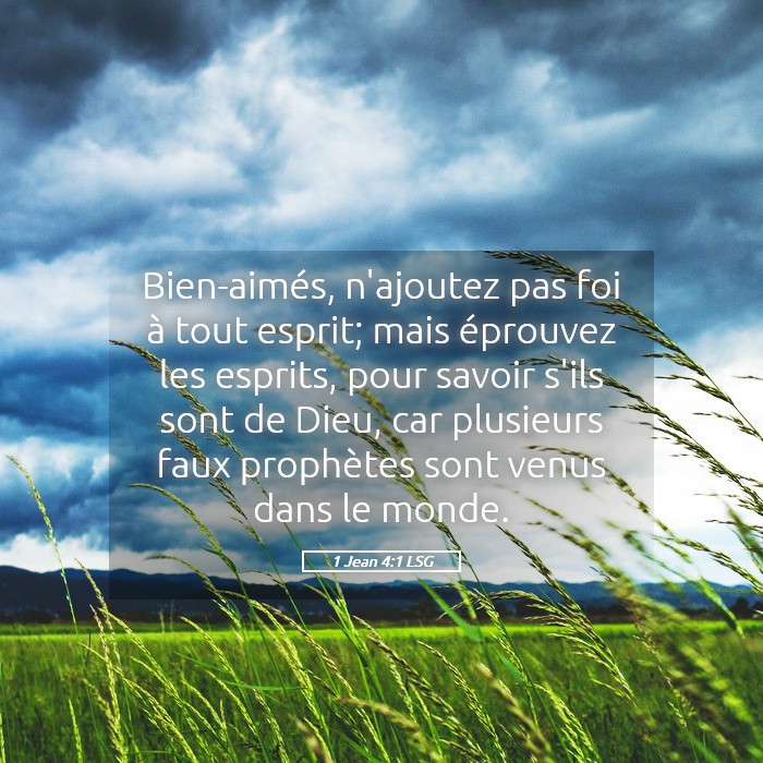 1 Bien-aimés, n’ajoutez pas foi à tout esprit ; mais éprouvez les esprits, pour savoir s’ils sont de Dieu, car plusieurs faux prophètes sont venus dans le monde.