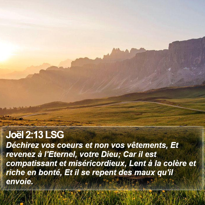 « Déchirez vos cœurs et non vos vêtements, et revenez à l'Éternel, votre Dieu ; car il est compatissant et miséricordieux, lent à la colère, riche en bonté, et il se repent des maux qu'il envoie. »